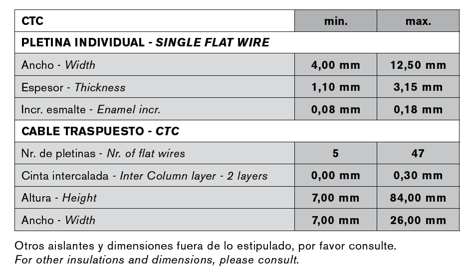 El Cable traspuesto se construye con un conjunto de pletinas esmaltadas que son cableadas y traspuestas. Este producto, que permite reducir las pérdidas eléctricas y ahorrar tiempos de bobinado, se usa en los bobinados de transformadores de potencia.